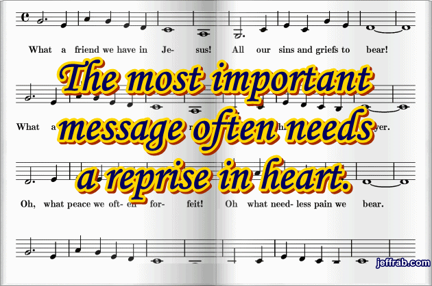 After twenty more minutes of reprise, the irritation faded. In fact, words to the tune began popping in my head. I found myself singing the verses inside with each reprise.