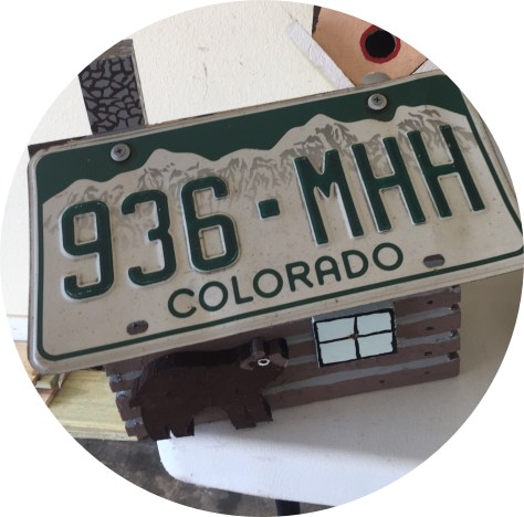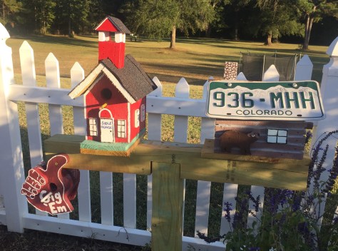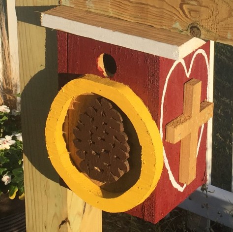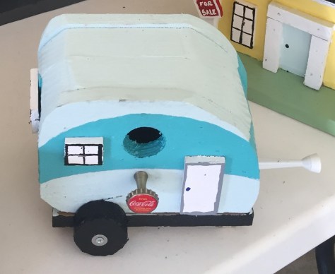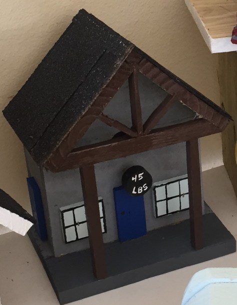 And then, in birth order, Jeff’s was a Colorado cabin with a bear on the outside that Charity always seems to spot. (And this was the first birdhouse to officially house a bluebird nest this Spring.)